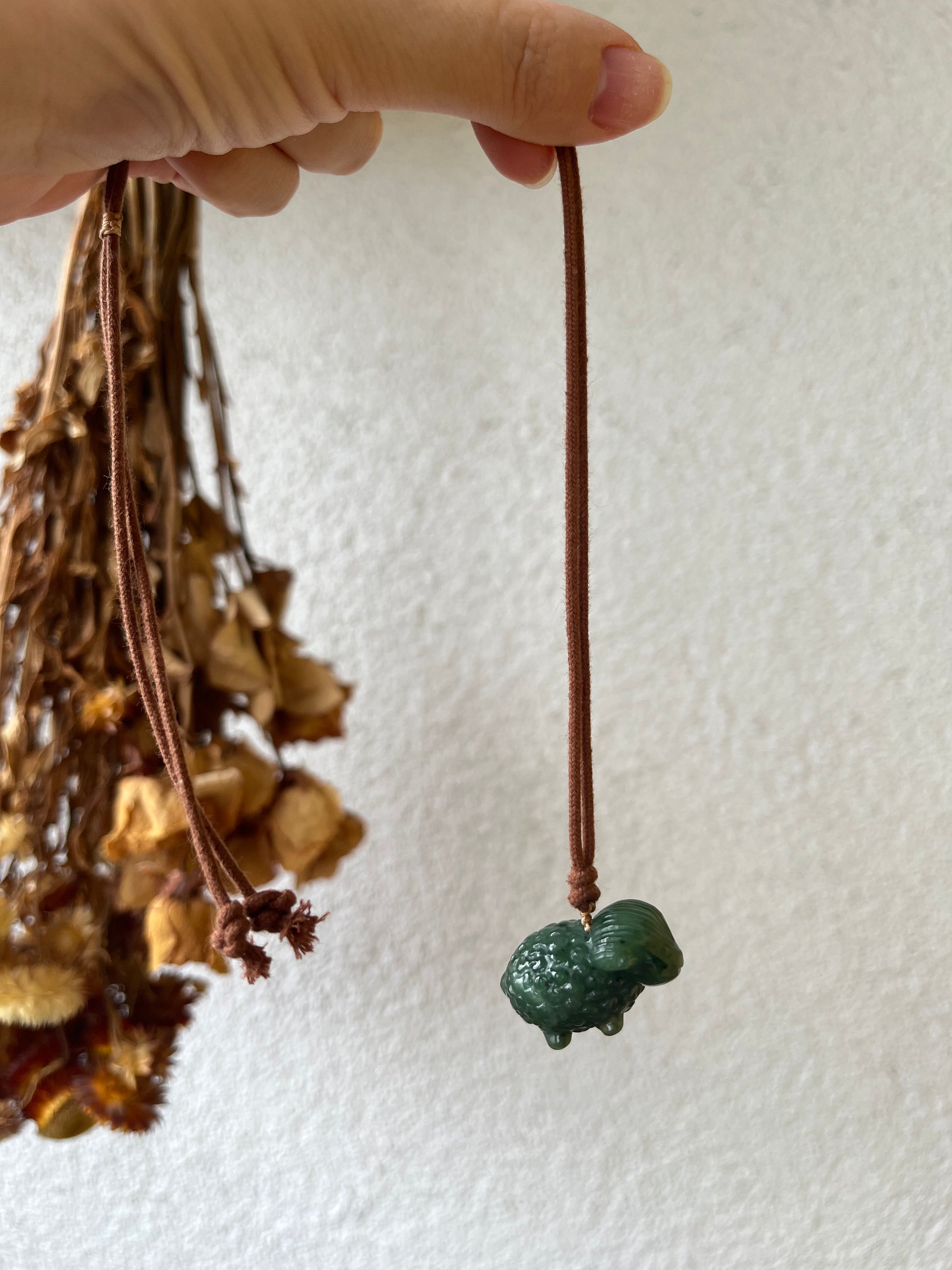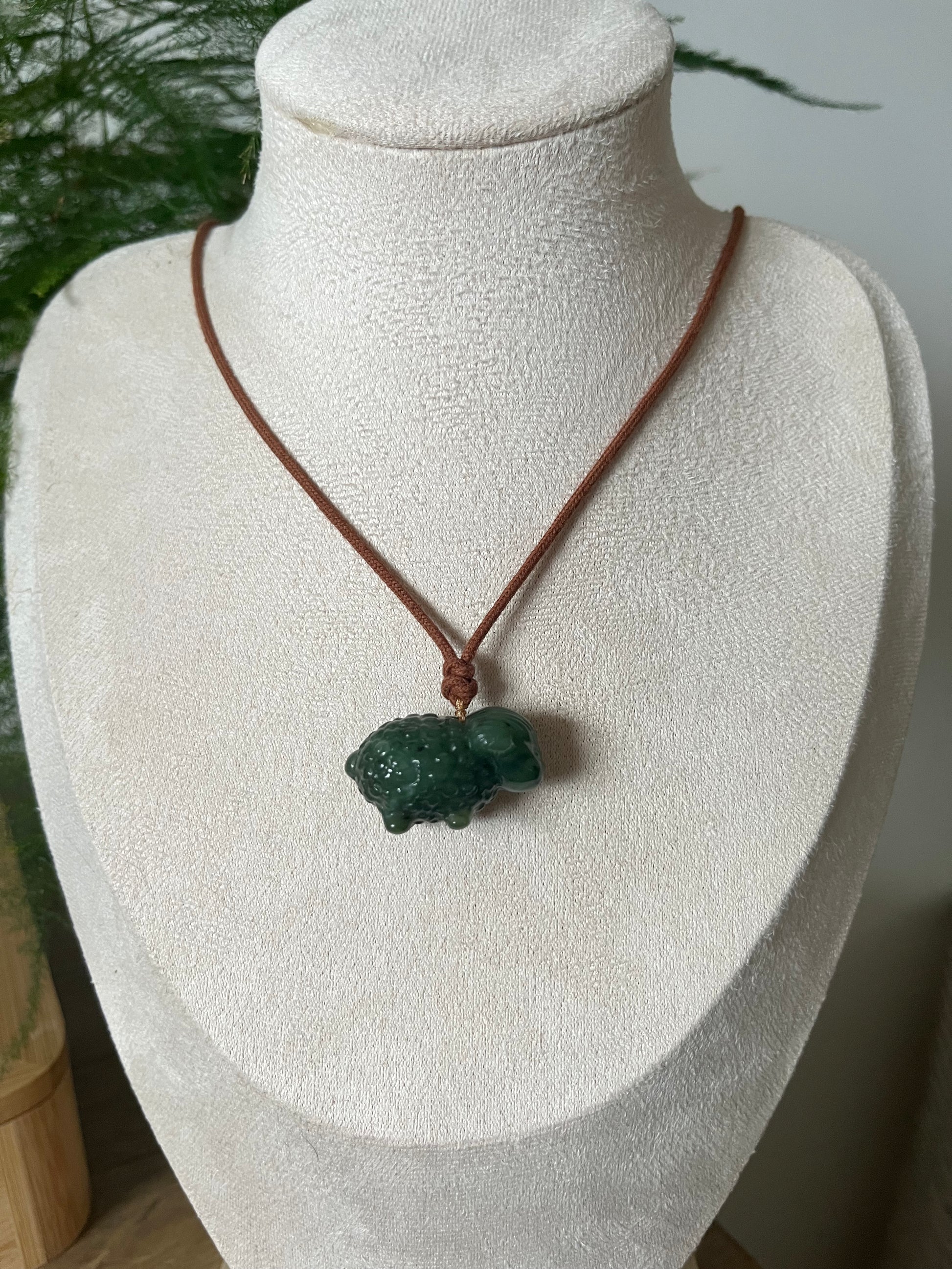 A necklace crafted from a super cute 3D carving green Hetian jade sheep.