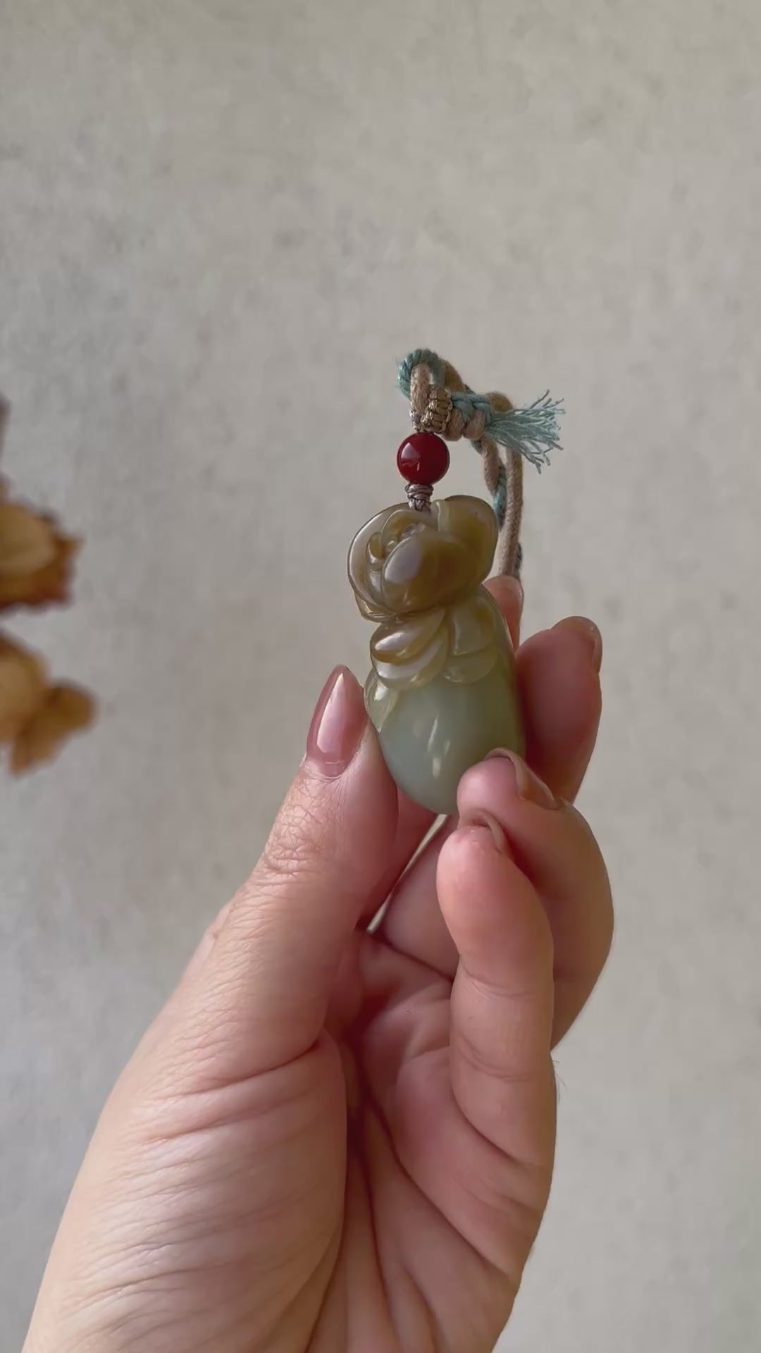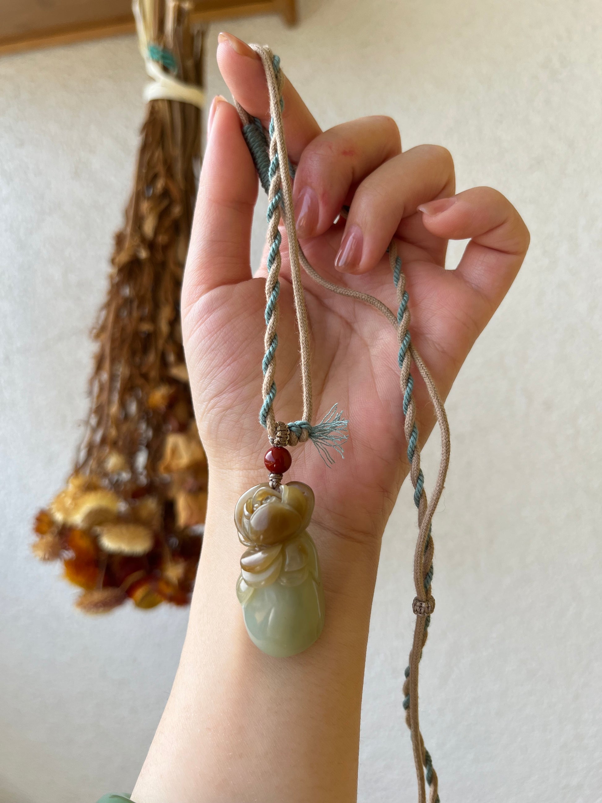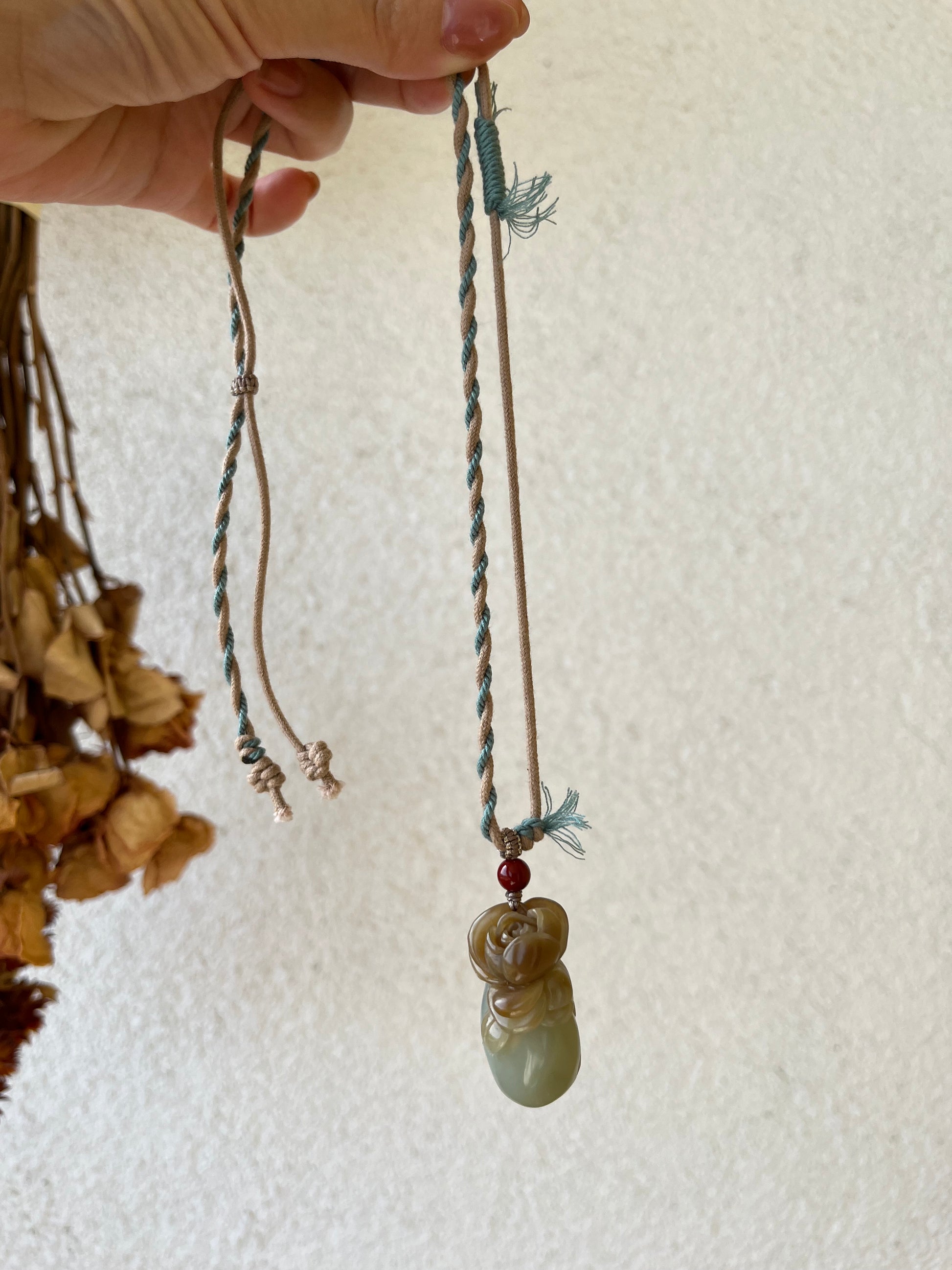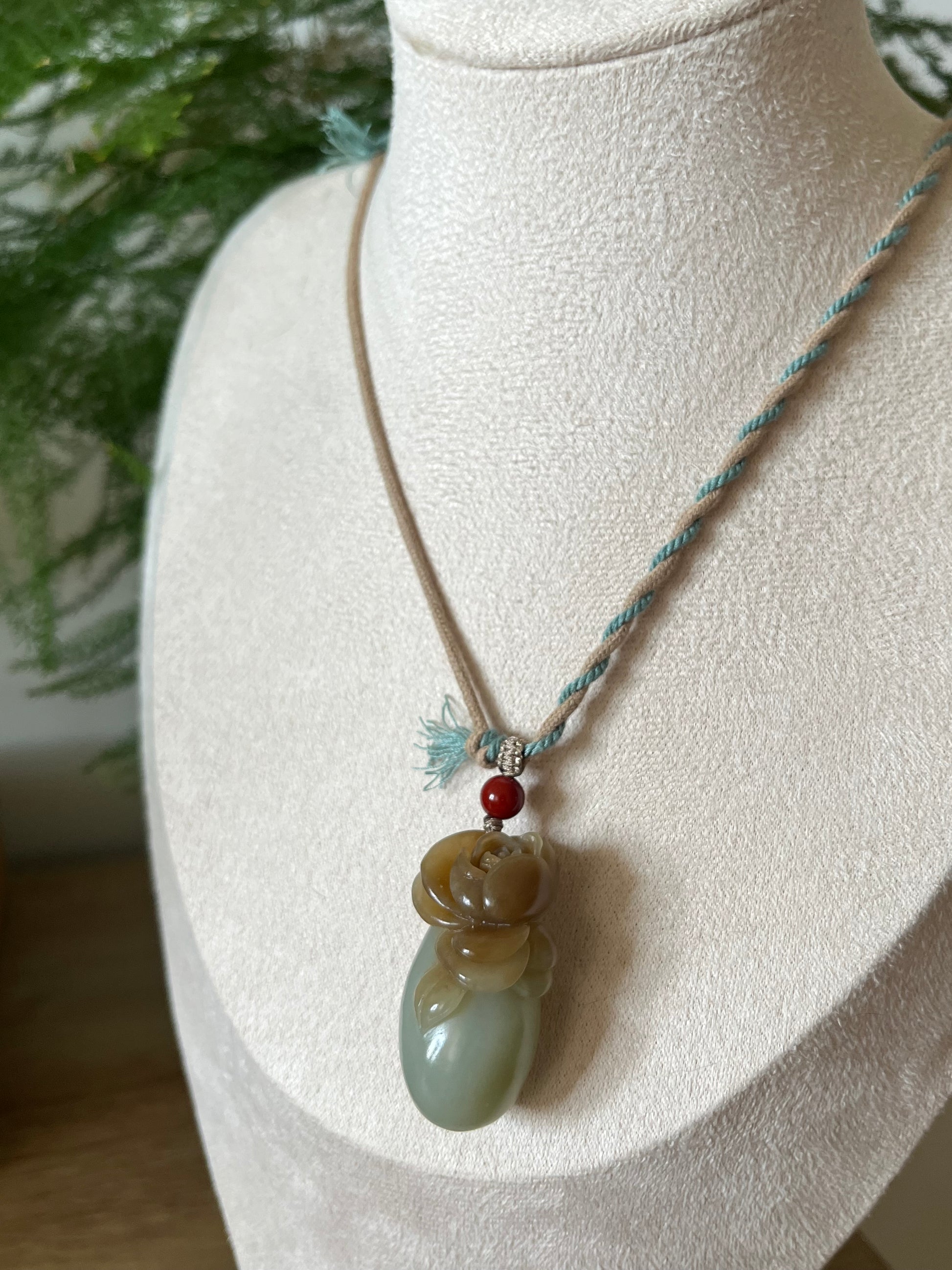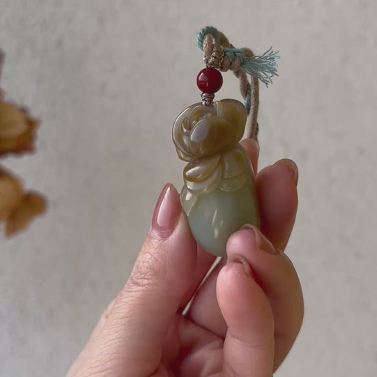 A designed necklace crafted from a beautifully hand carved Hetian jade rose pendant. The rose was carved following the jade's natural russet (sugar-like) color.