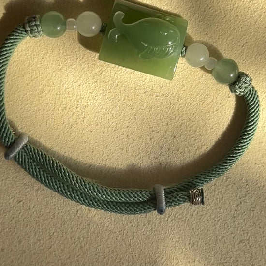 A bracelet crafted from a cute hand carved Green Hetian jade whale pendant.