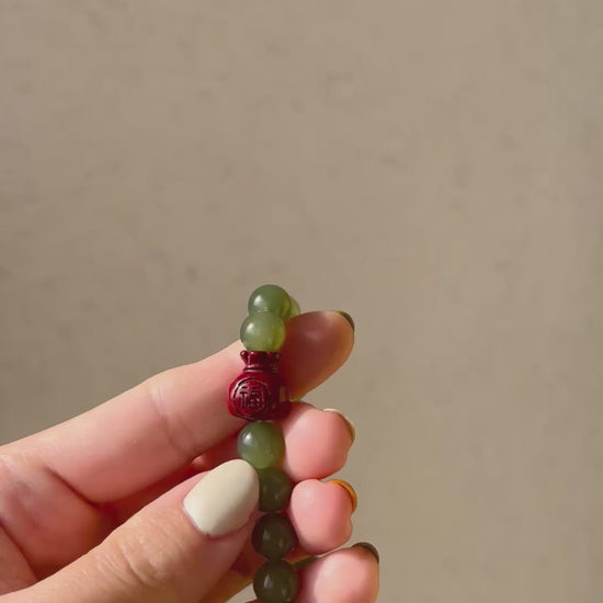 Bracelet with 8mm Icy Green Jade Beads and a Cinnabar Lucky Bag, 和田冰湖水绿珠加朱砂福袋手串