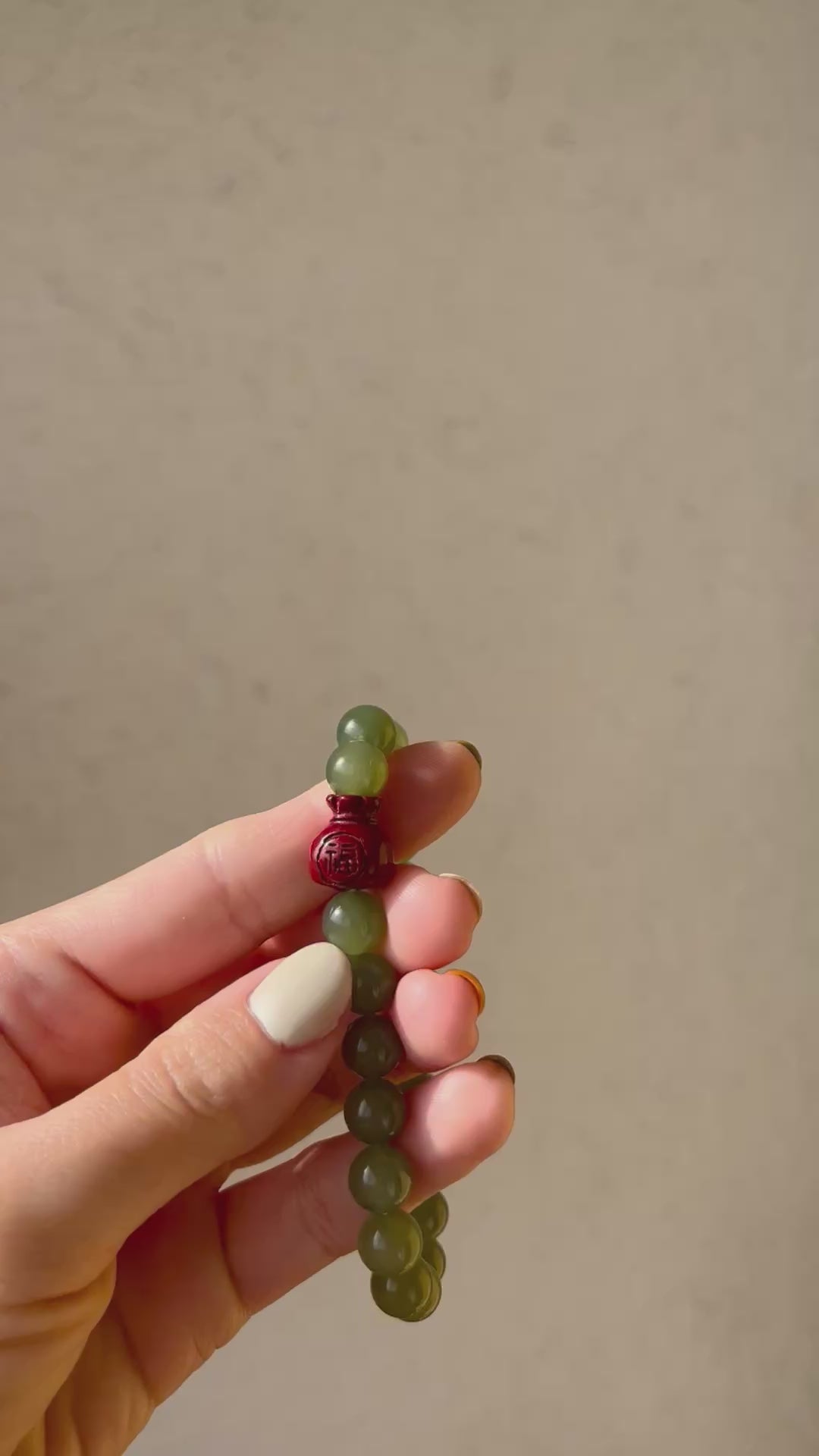 The bracelet is crafted from icy green nephrite beads, 8mm beads and a cinnabar lucky bag, there is a Chinese sign 'fu' - '福' in the lucky bag bead.