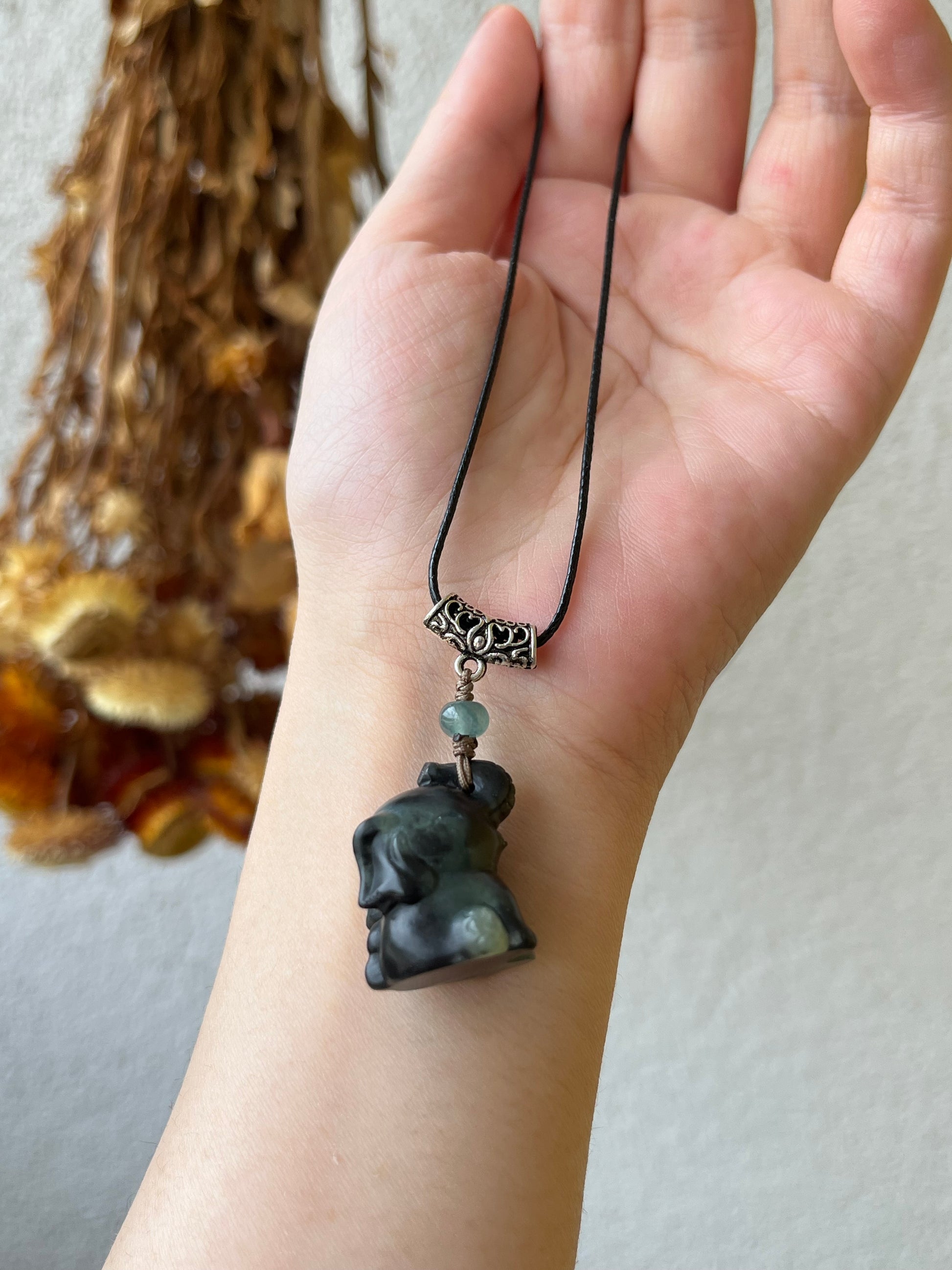 A necklace crafted from a super cute nicely carved black Qinghua Hetian jade elephant pendant. There is natural color variation.