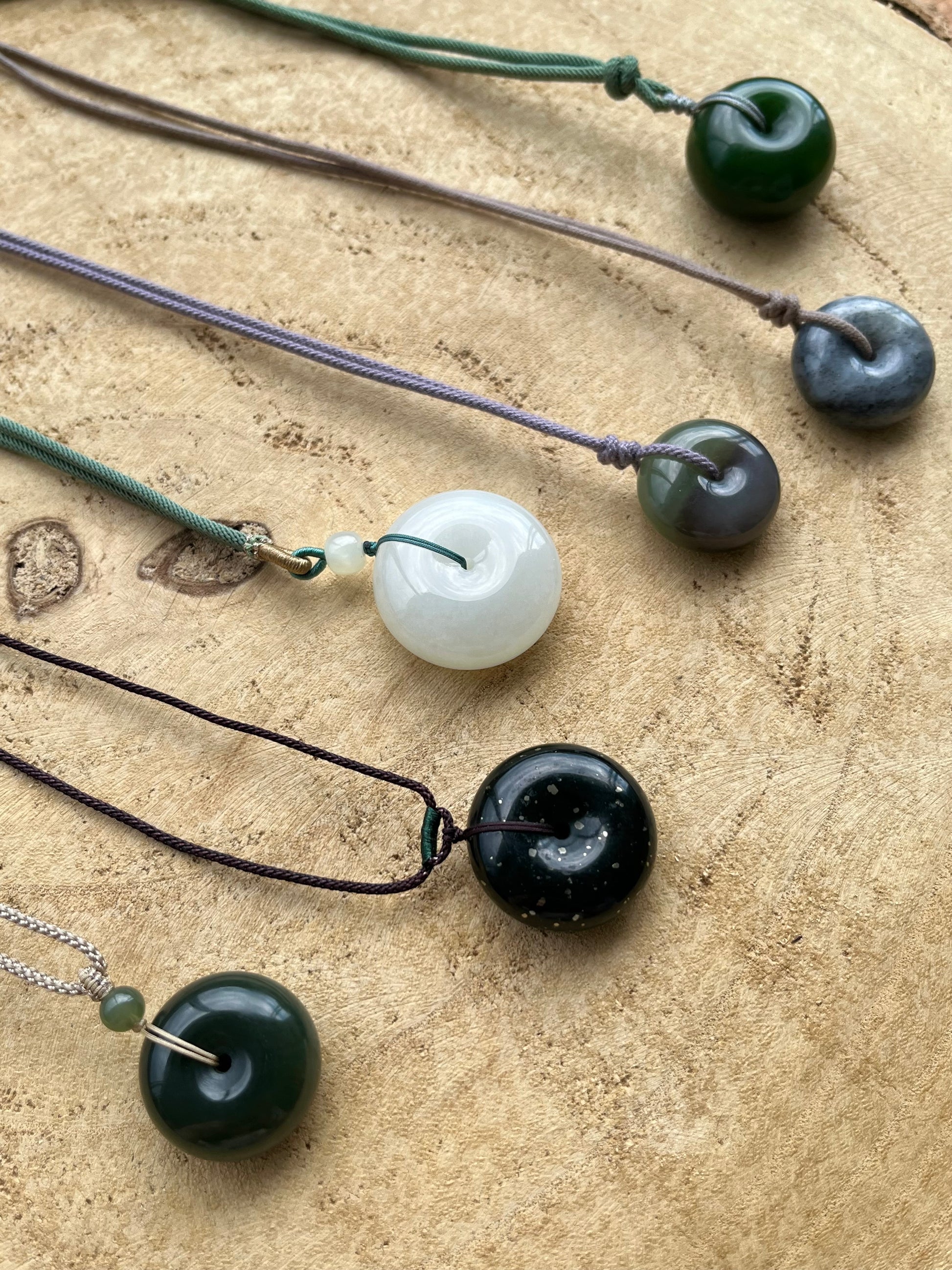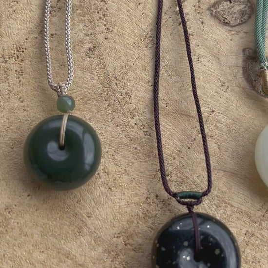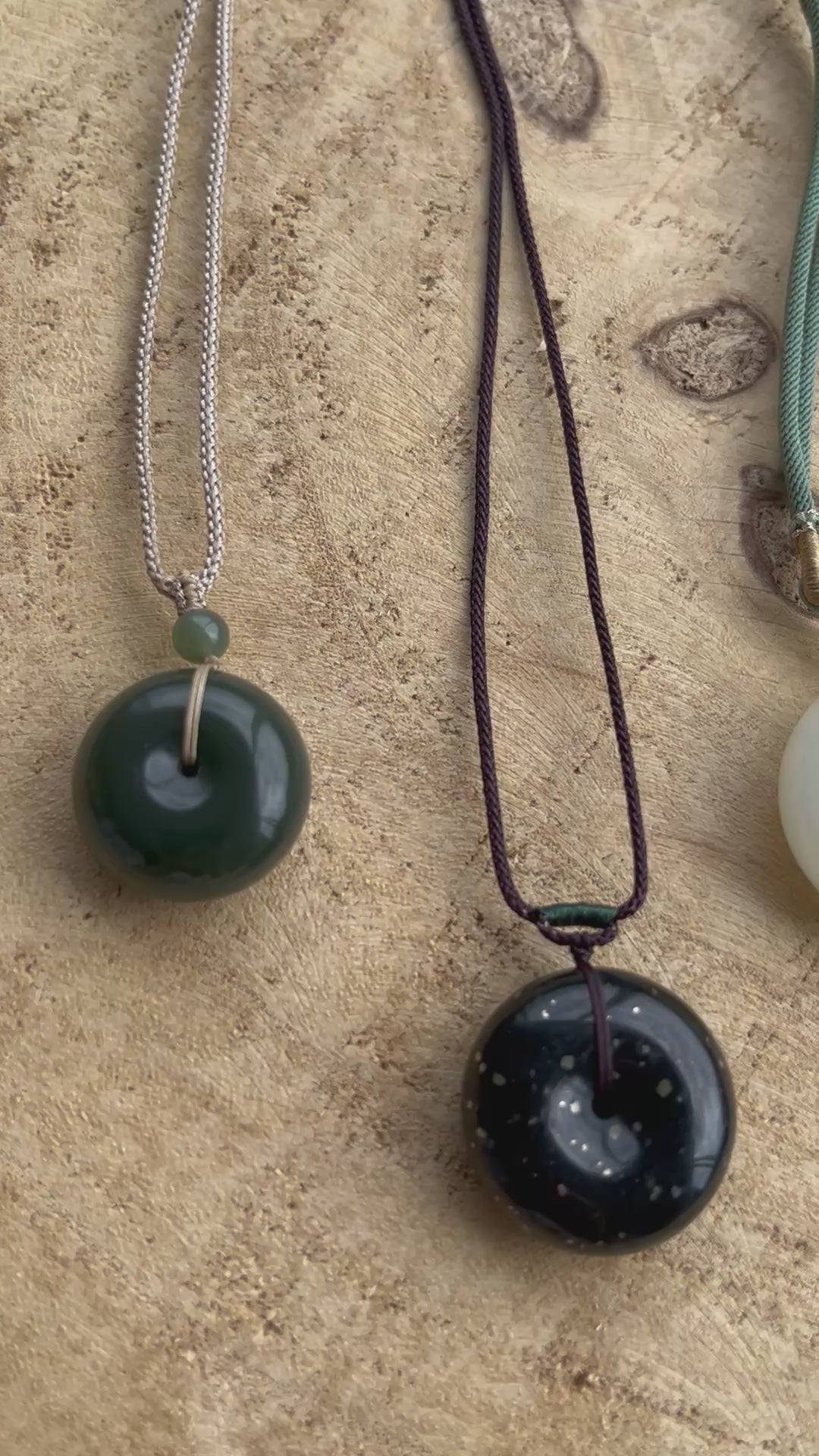 The PI pendant, in Chinese "Ping An Kou" (平安扣) is a traditional Chinese jade amulet, symbolizing peace, safety, and protection. Wearing a Ping An Kou is believed to bring tranquility, ward off negative energy, and safeguard the wearer from harm. It is often gifted to loved ones as a token of care and a wish for their well-being, representing a connection between the giver and the wearer, and conveying blessings for a peaceful and prosperous life.
