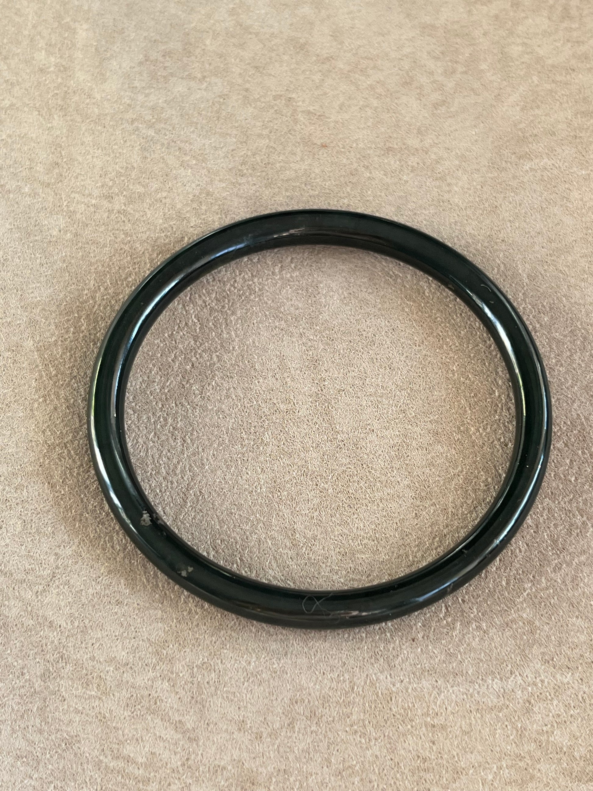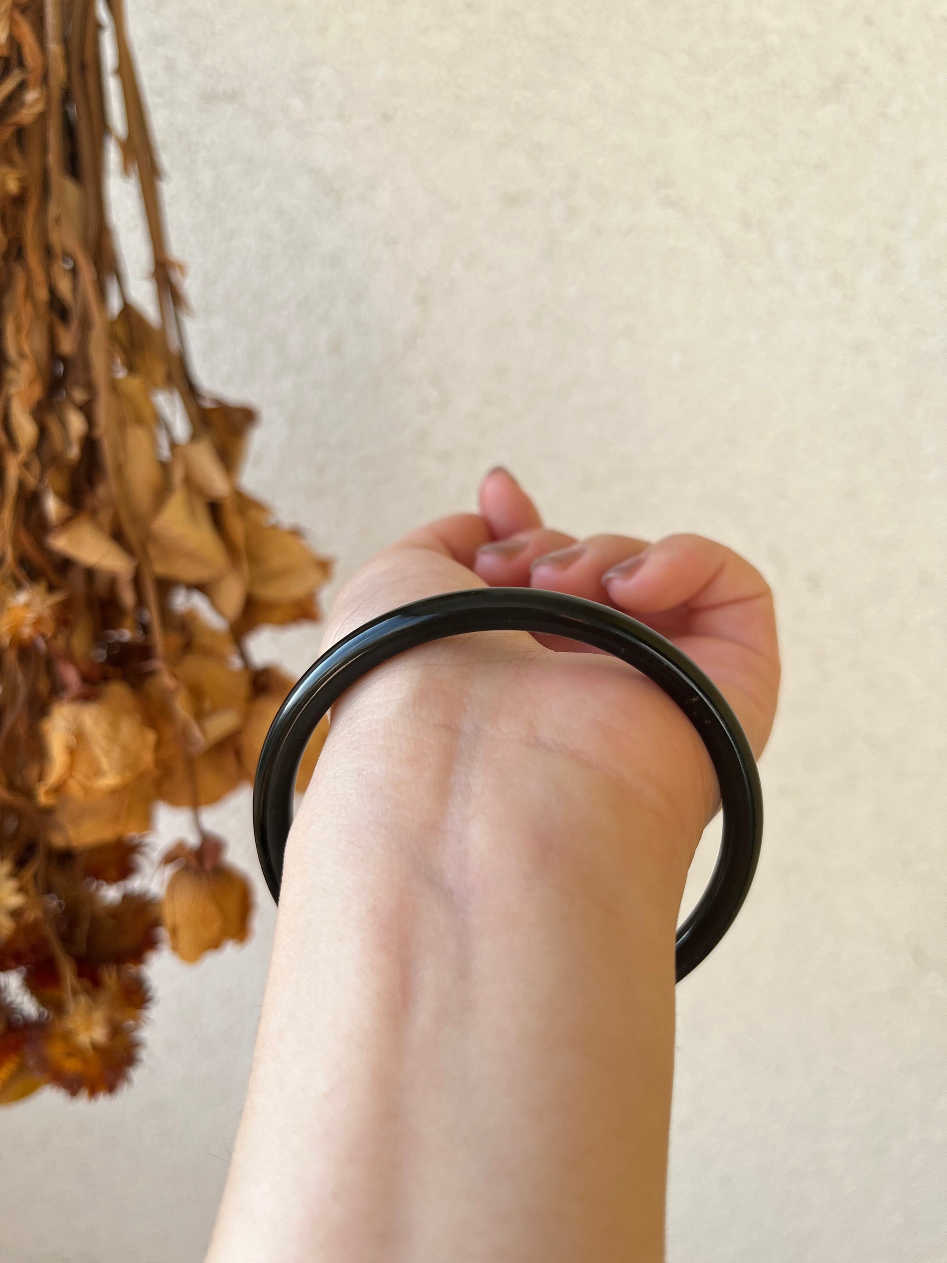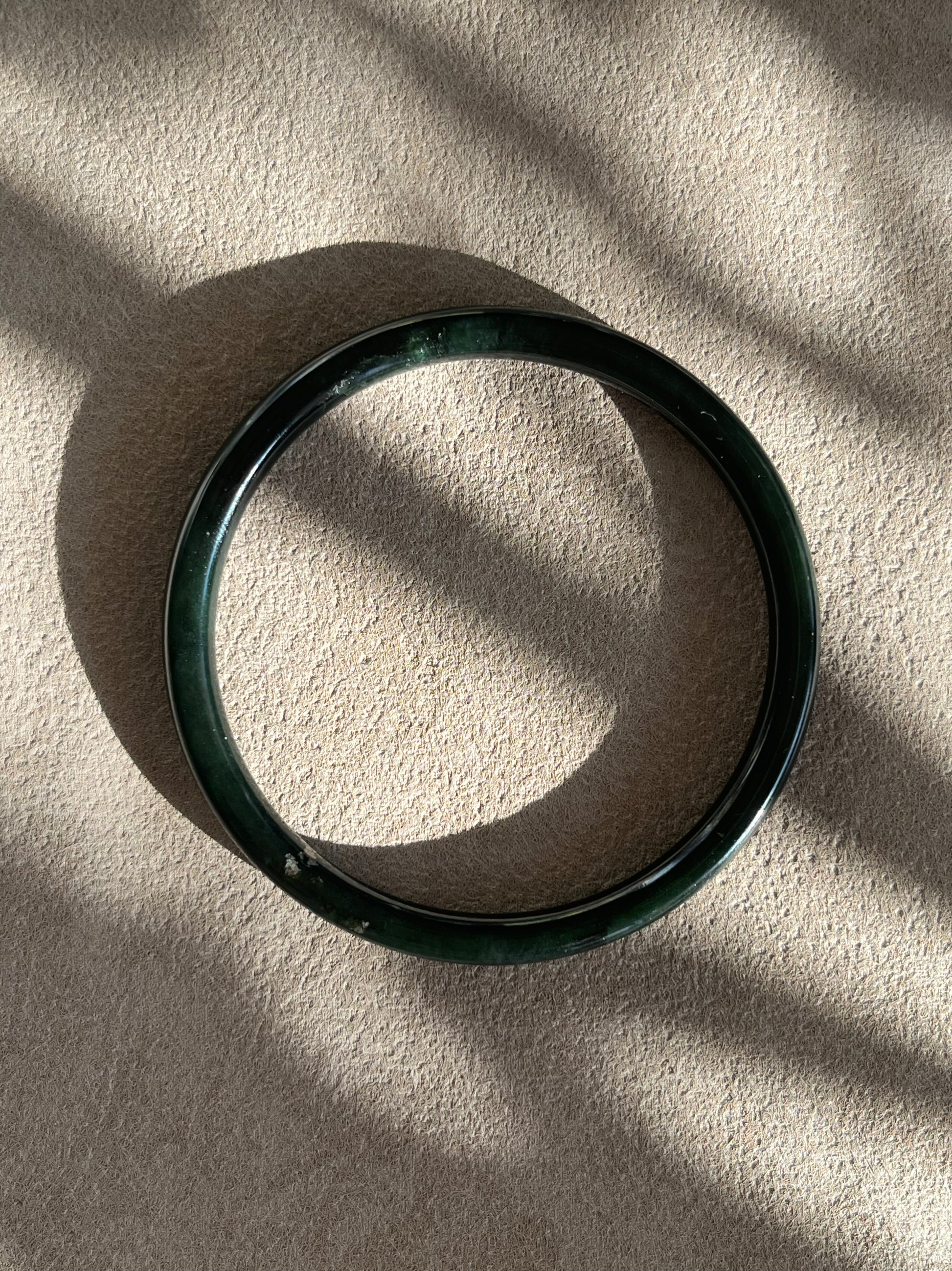 Dark Greenish-black bangle. This bangle appears black under normal lighting, and shows a greenish tone under strong light. Some small areas of the surface are dotted with unique silvery spots of chalcopyrite, creating a natural gold leaf effect. Xinjiang black-green Hetian jade is known for its rich, oily luster.