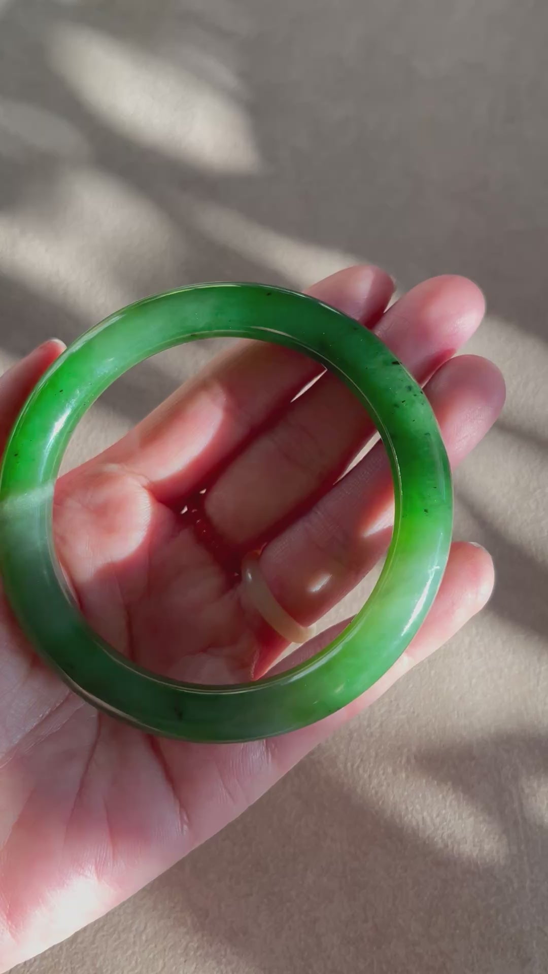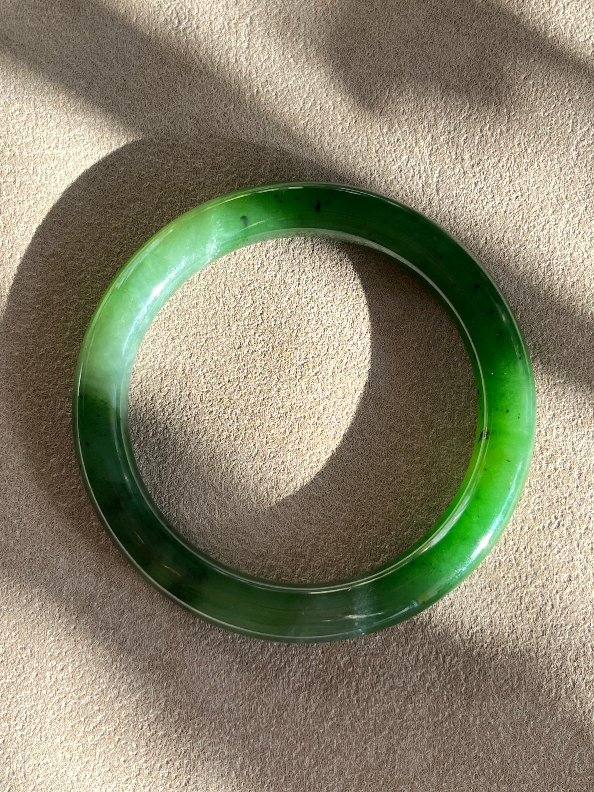 Green Hetian jade bangle. This bangle features fine texture and beautiful green color, with natural black spots and struture.