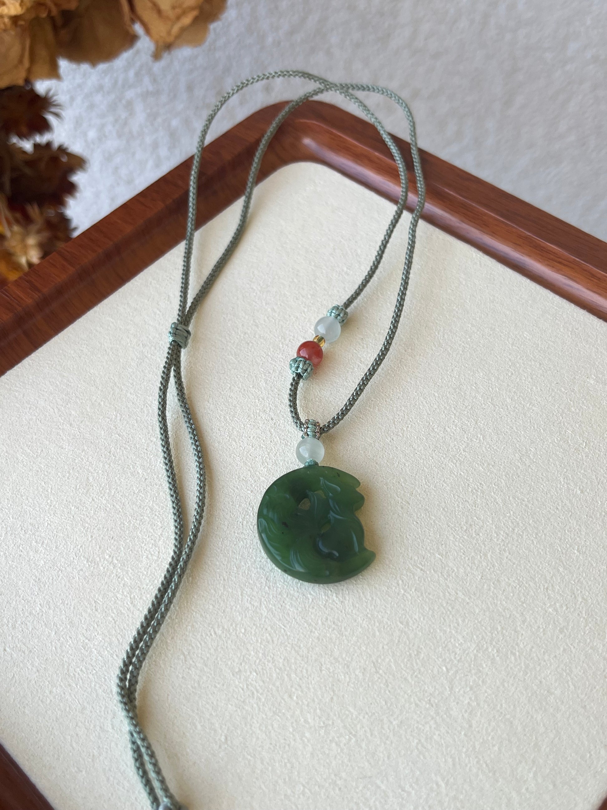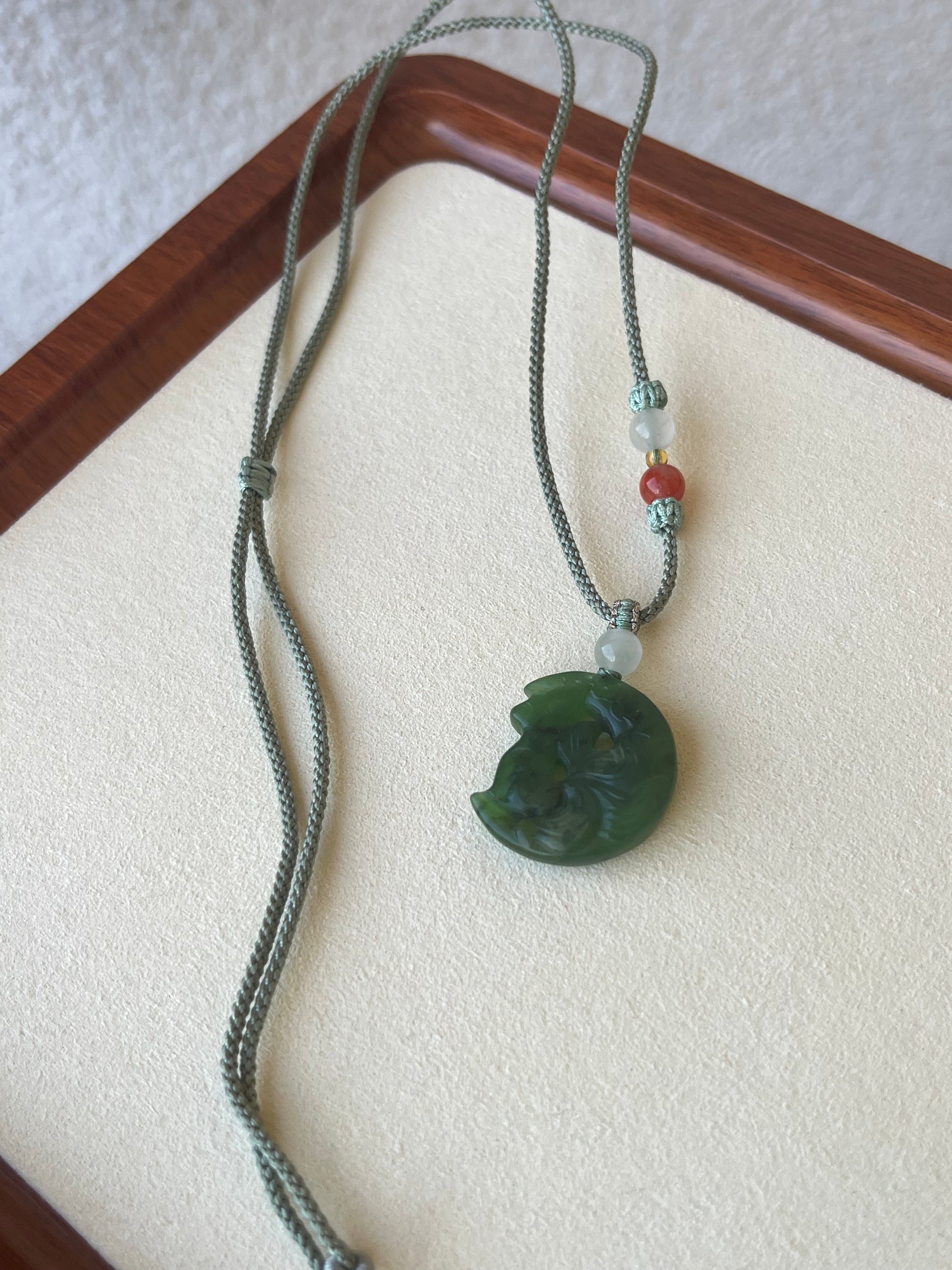 A necklace crafted from a green Hetian Jade nine-tailed fox pendant.