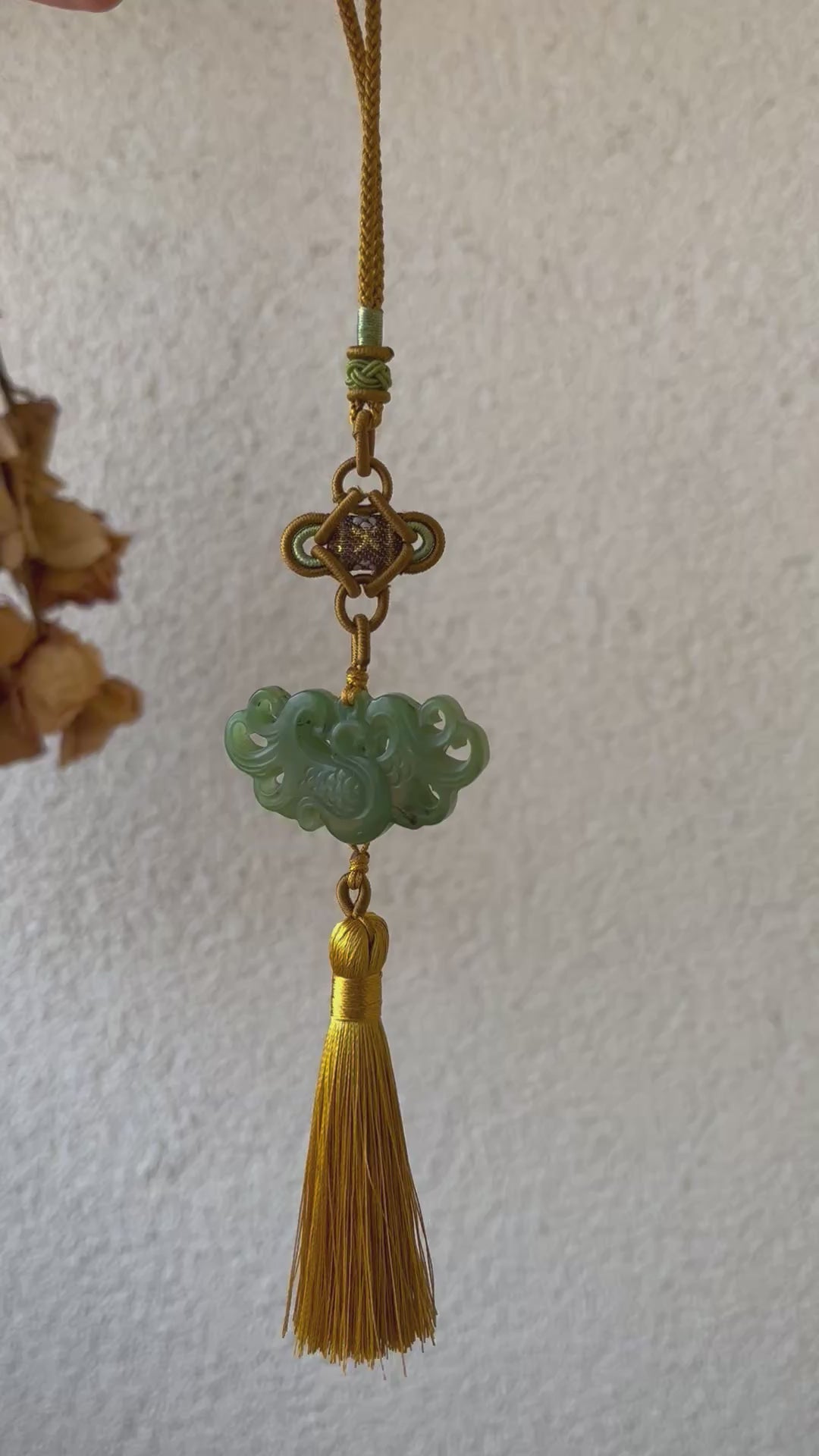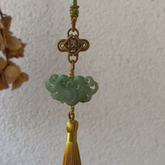 A hanging crafted from a Hetian green jade phoenix pendant. It can be used as a car hanging, bag charm.