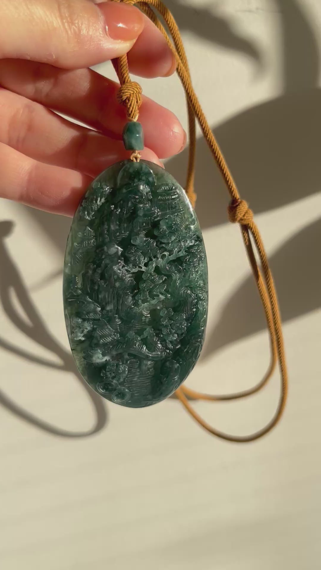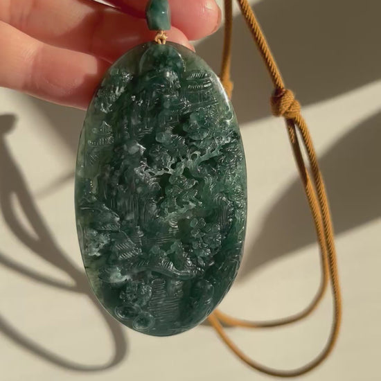 A necklace crafted from a hand carved jadeite landscape pendant. The pendant contains natural cotton-like inclusions, and the landscape carving theme enhances the pendant’s sense of depth and artistic atmosphere.