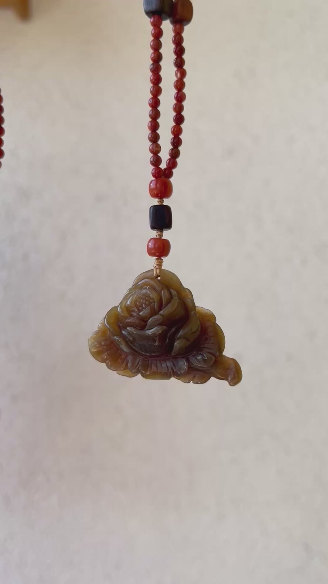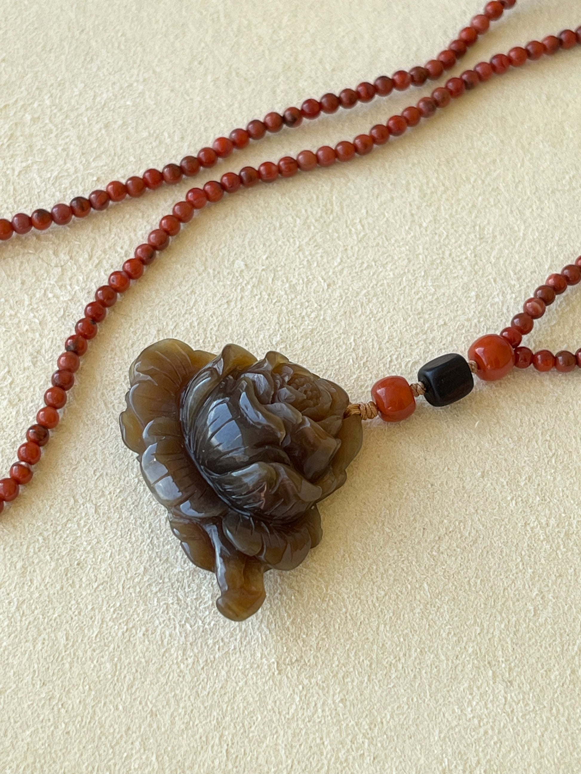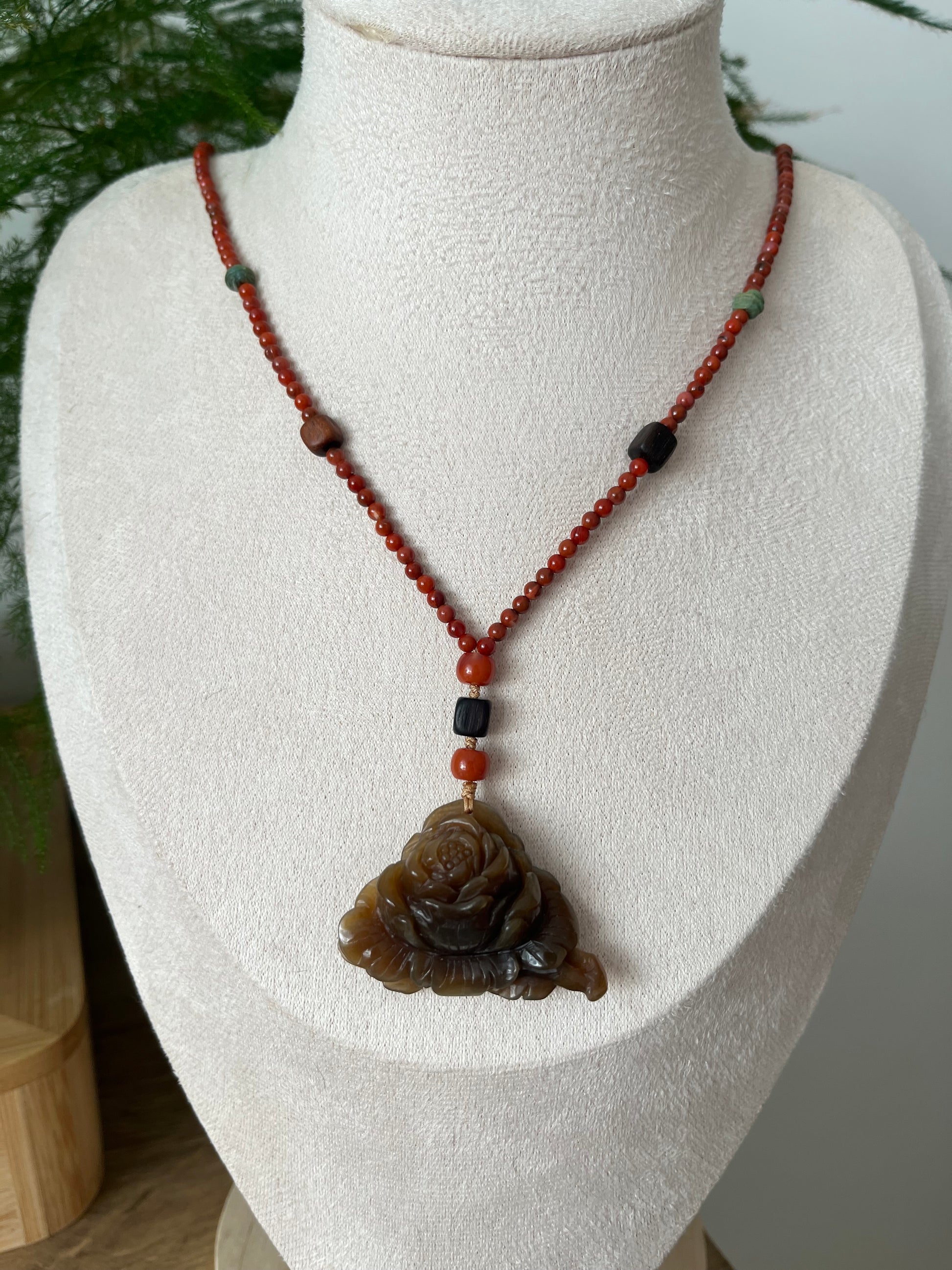 A necklace crafted from a hand carved a brown Hetian jade peony flower pendant. The cord is crafted from Nanhong agate beads, agarwood beads and turquoise beads.