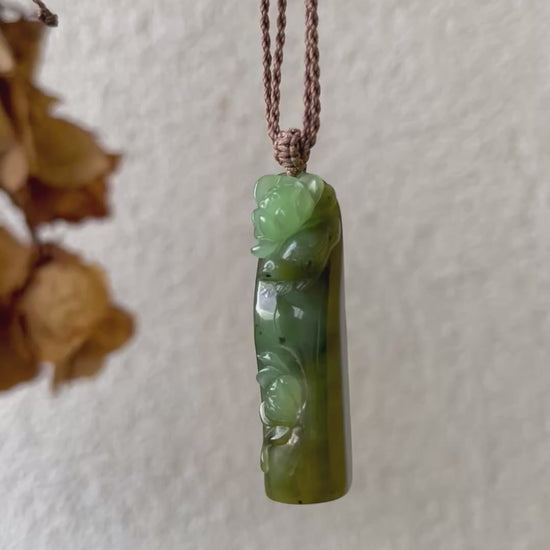 A necklace crafted from a hand carved green Hetian jade lotus and magpie pendant.