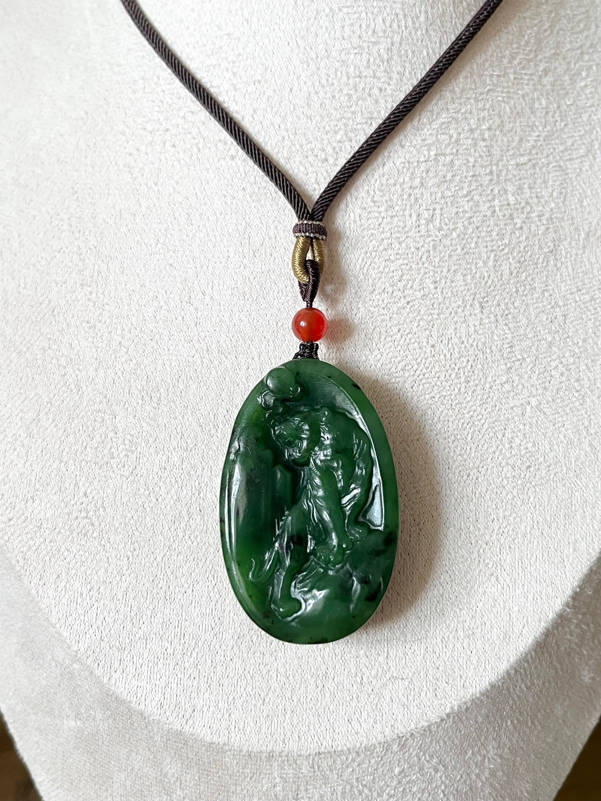 A pendant crafted from natural nephrite green jade. The pendant has natural black mineral points but the craftsmanship is excellent.