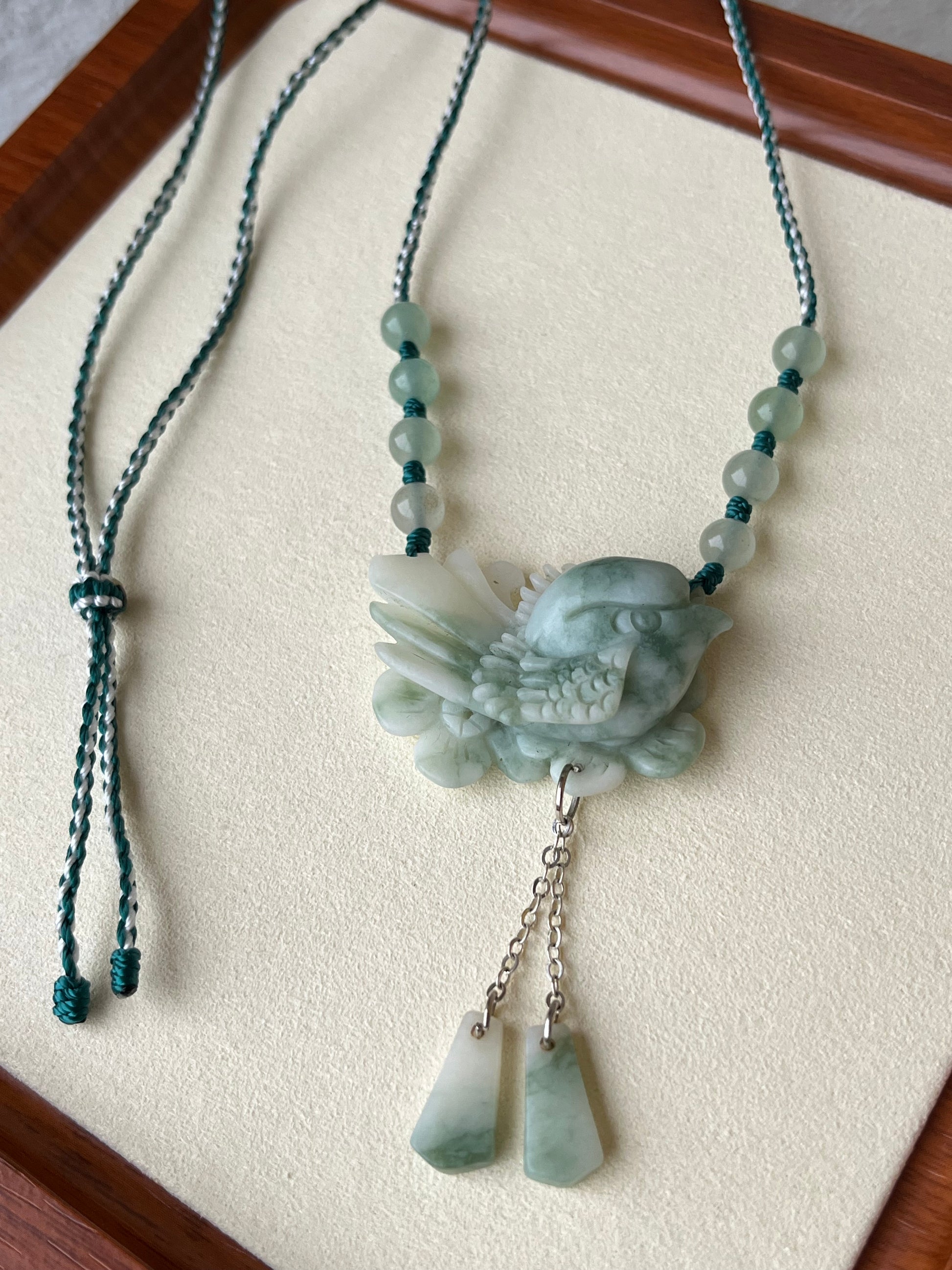 A necklace crafted from a cute hand carved green Xiu jade magpie pendant.