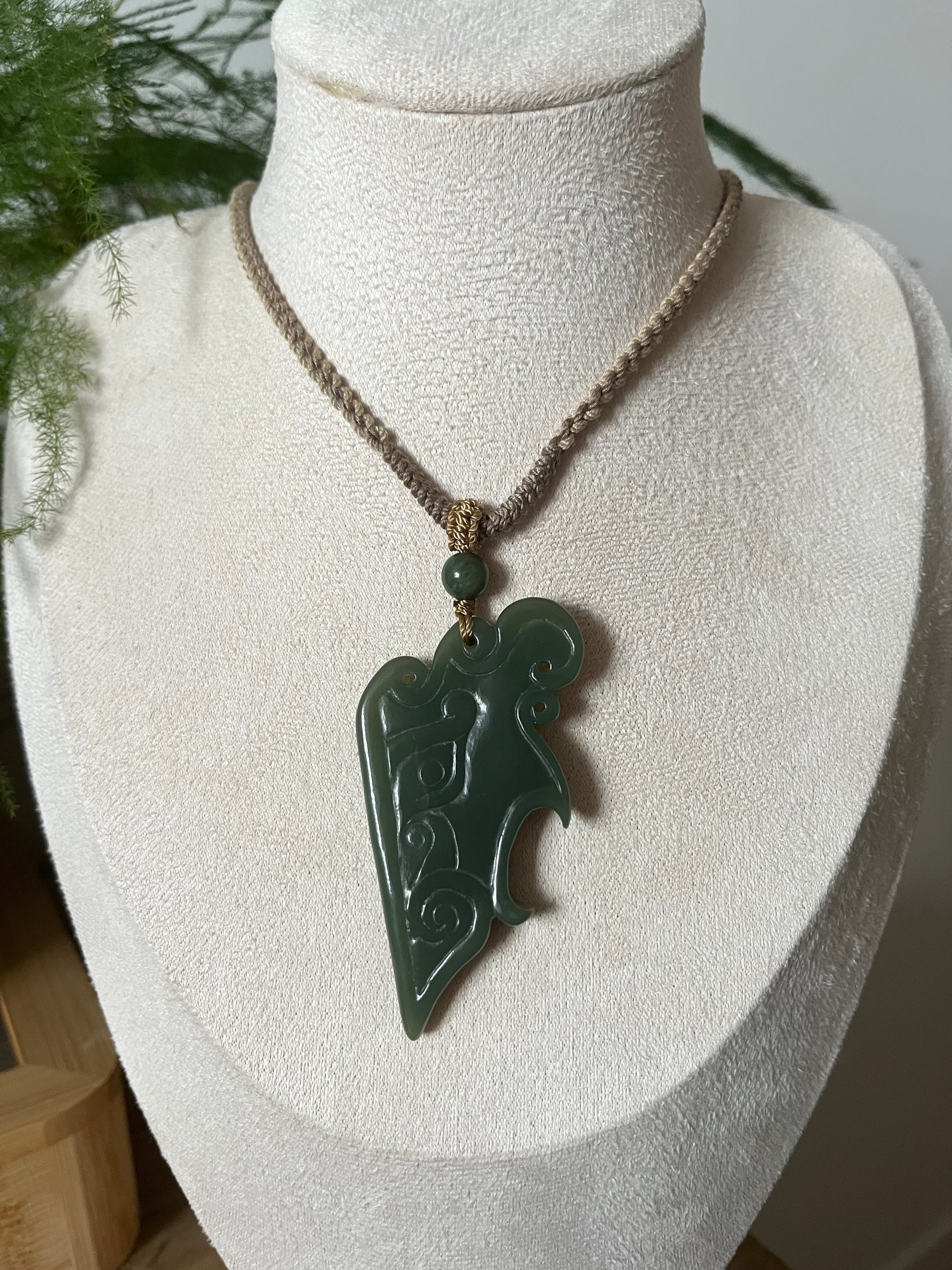 A necklace crafted from a hand carved Hetian jade antique style pendant.