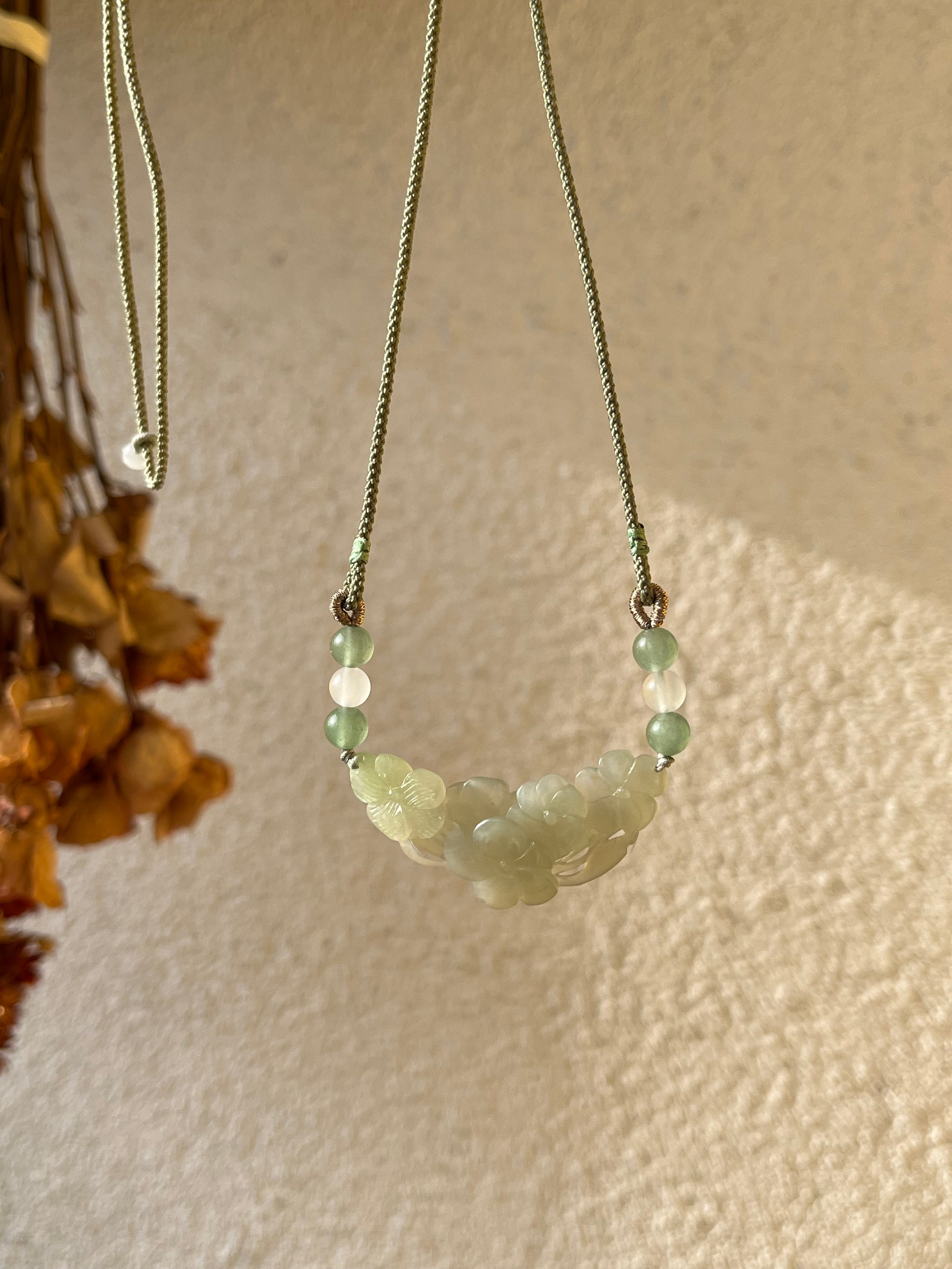A necklace crafted from a double side hand carved jade plum blossom arc-shaped pendant.