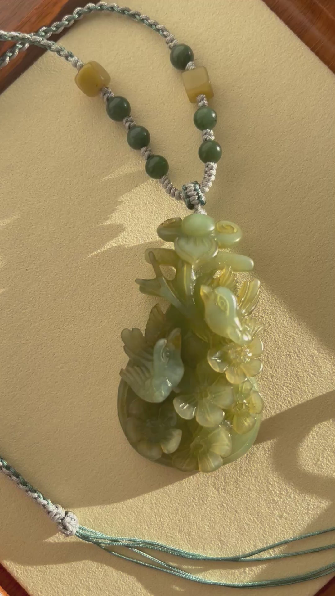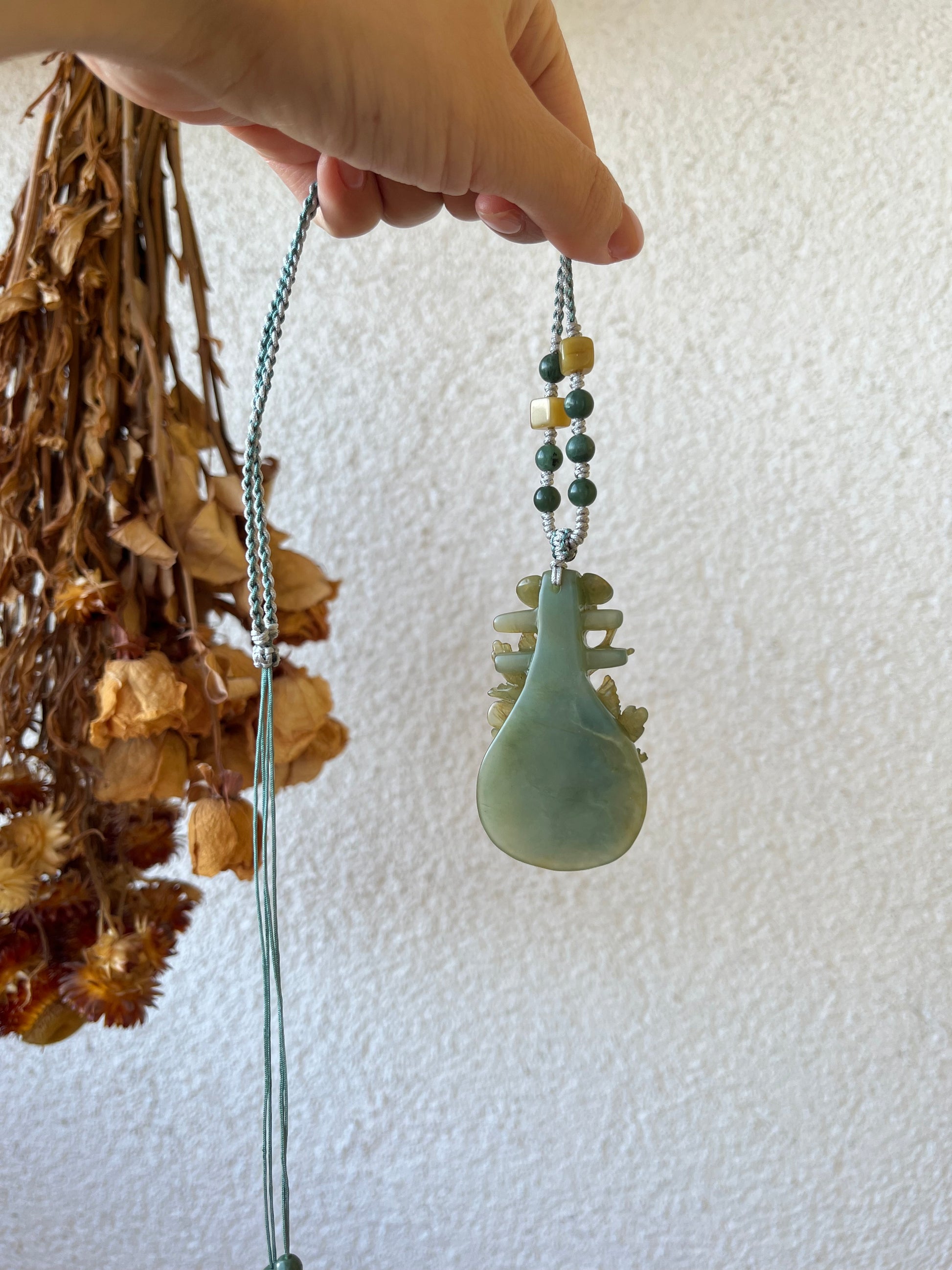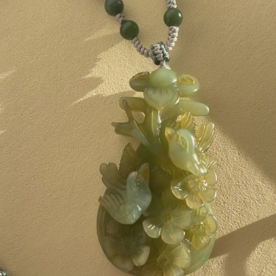 A necklace crafted from a hand carved blue and yellow Xiu jade 'Happiness at the Brows' in a Pipa shaped pendant. The carving has excellent three-dimensional detail.