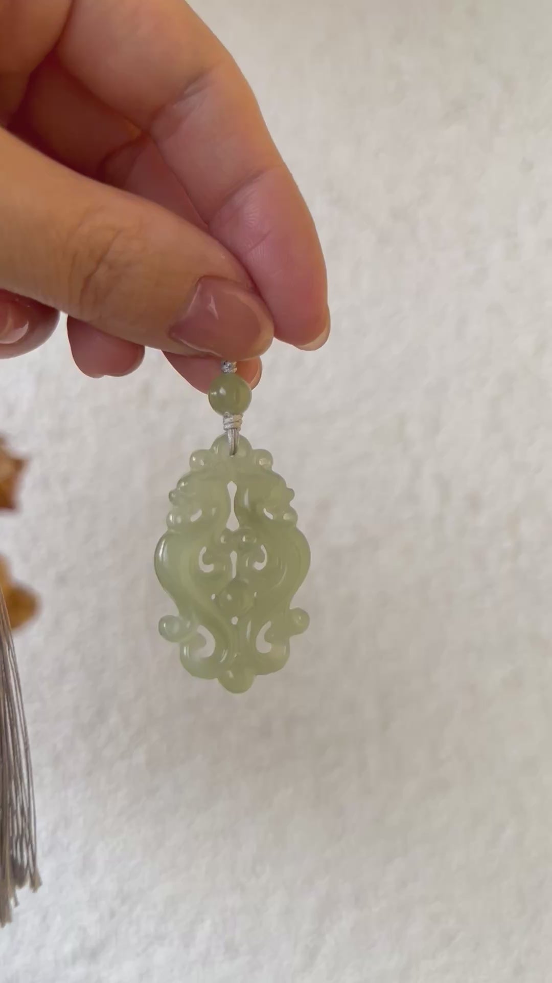 A bag charm crafted from a carved Hetian jade dragon and phoenix pendant. It's carved from a piece of very clean jade.