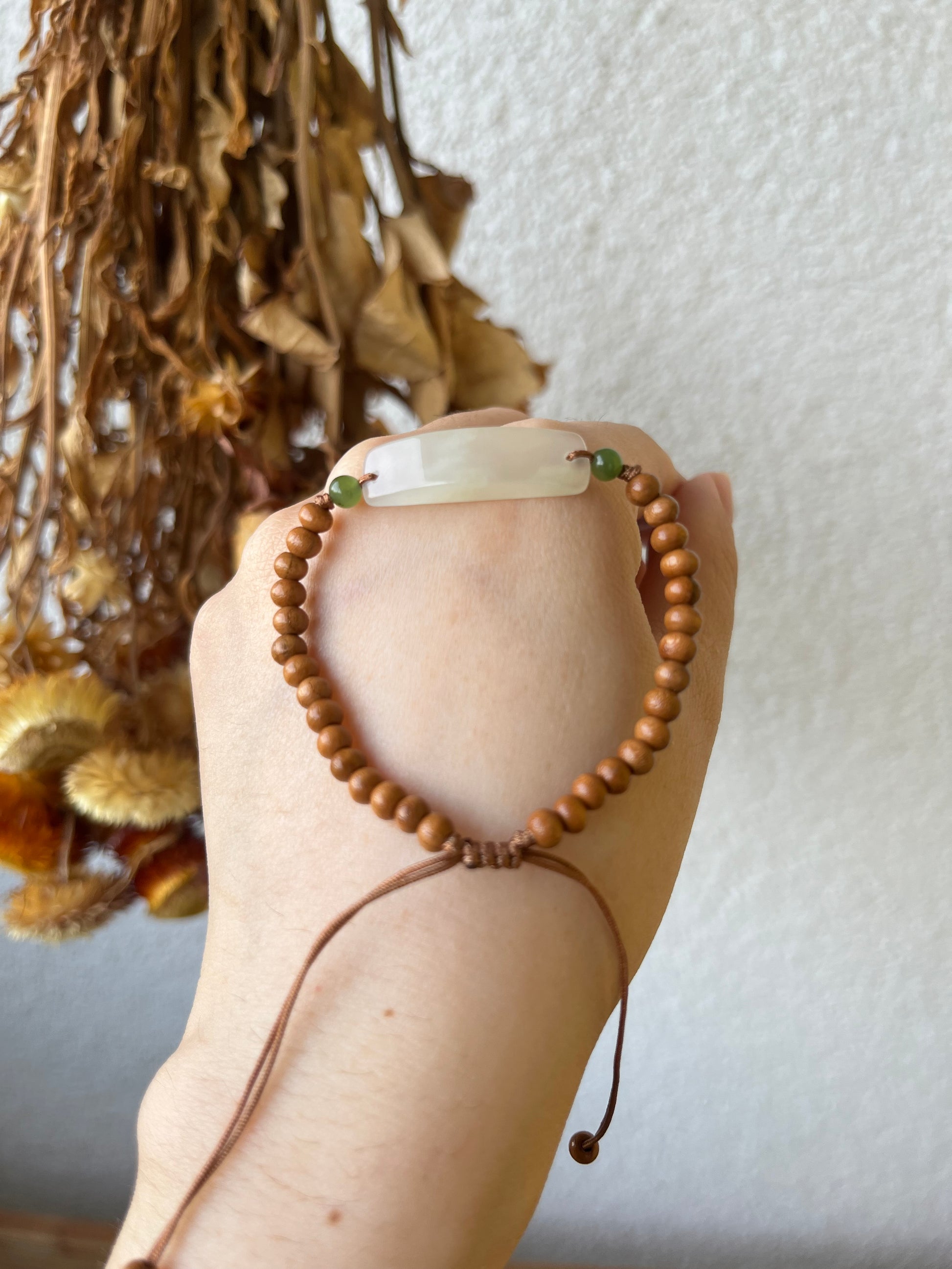 A simple bracelet crafted from a small Hetian jade pendant (22mm x 8mm x 5mm) and olive nut beads (4mm x 3mm).