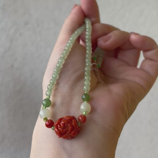 A necklace crafted from 4mm icy green nephrite beads, a Nanhong agate peony flower pendant, 2 Nanhong agate beads (5mm), 2 white nephrite beads (6mm x 5mm), 2 green nephrite beads (5mm).