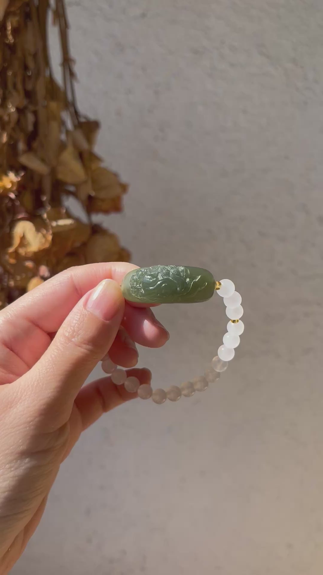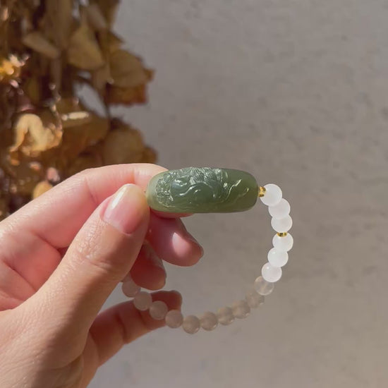 Handmade Bracelet with a Hand Carved Green Hetian Jade Nine Tailed Fox Pendant