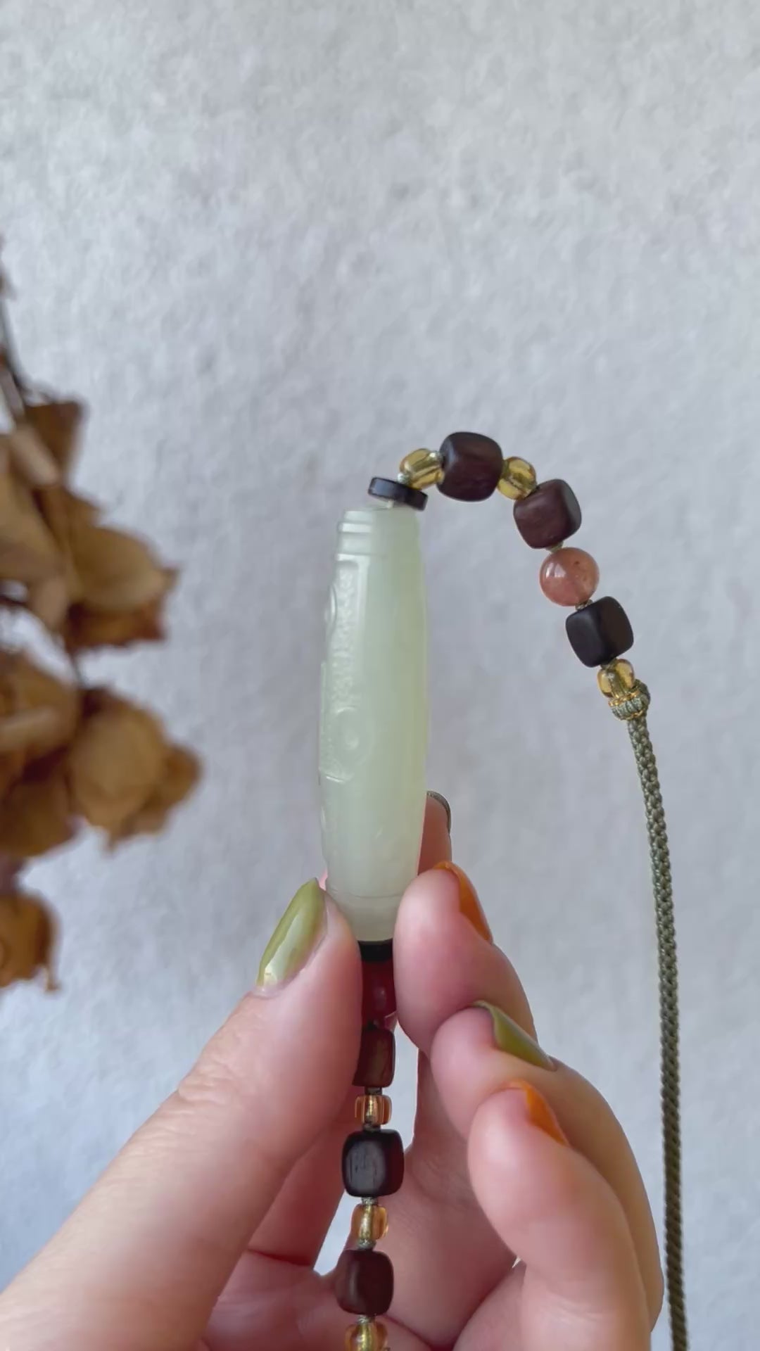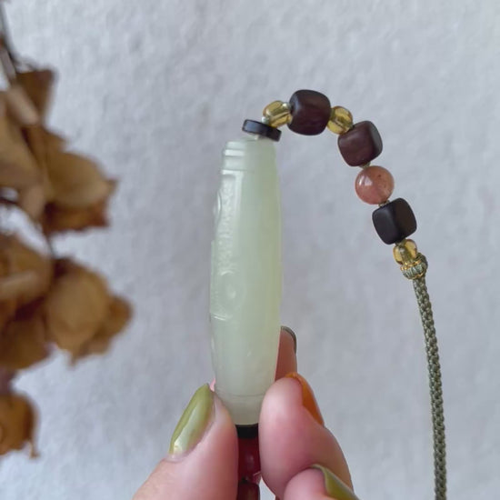 A necklace crafted from a carved Hetian jade nine-eyed dzi bead.