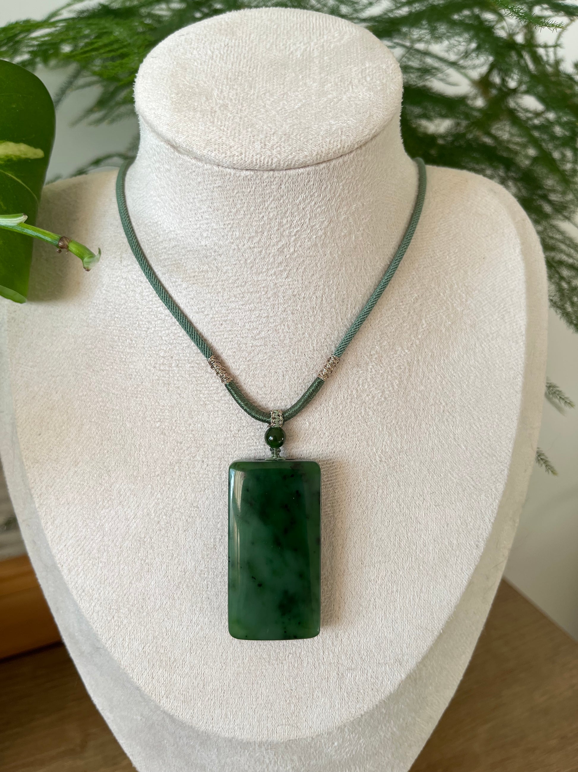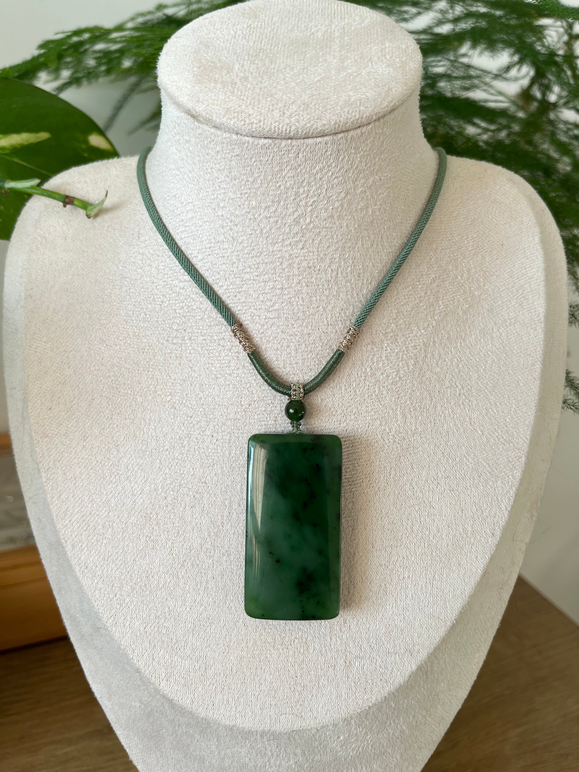 A necklace crafted from a green Hetian jade flat pendant.