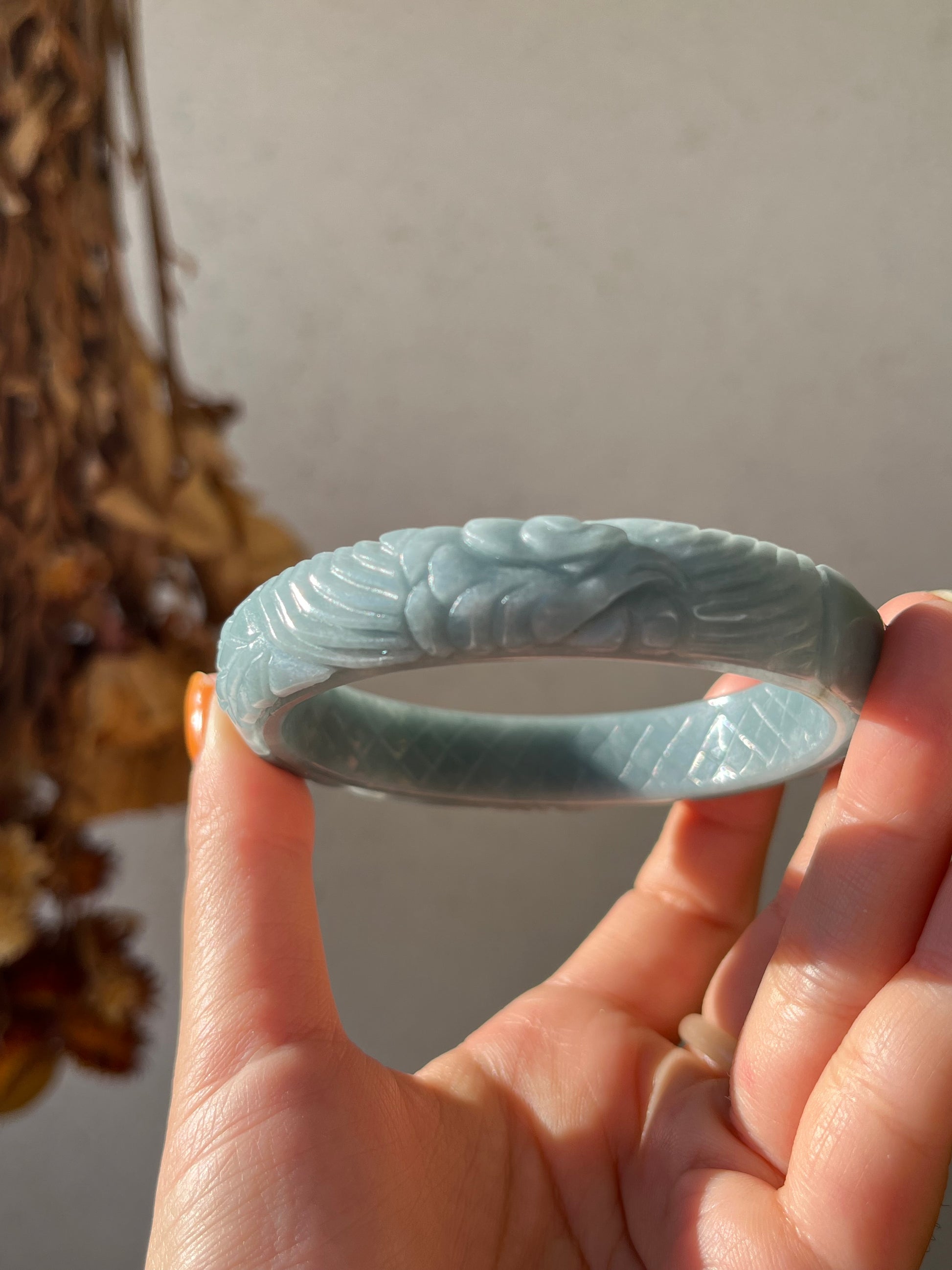 Sky Blue Jadeite Carved Bangle 60mm, Phoenix Motif | 天空蓝翡翠凤凰雕刻手镯